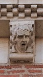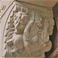 Consoles リンテルを支える2つのコンソールは彫刻されていて、左に音楽を奏でるダヴィデ王、右に、膝の上でライオンを抑え込む、片足は裸足でもう一方の足はサンダルを履き、フリジア帽をかぶった2人の人物が表現されています。これら2人の人物は、かつて西入り口を飾っていた、現在はオーギュスタン美術館にて展示されているレリーフ(le signe de lion et lesigne de bélier)を想起させます。 Deux consoles supportant le linteau représentent, à gauche le roi David miusicien, et à droite deux personnages, laissant l'un de leurs pieds nu et l'autre chaussé, coiffés des bonnets phrygiens, qui tiennent chacun un lion sur les genoux. Ces personnages rappellent le grand bas-relief mystérieux, lesigne de lion et le signe de bélier, qui ornait le portail occidental, mais aujourd'hui exposé au musée des Augustins. |