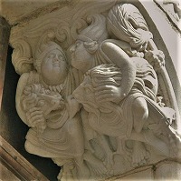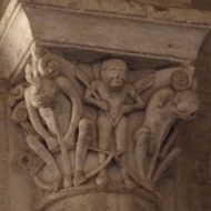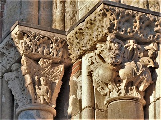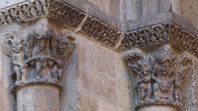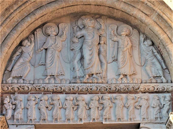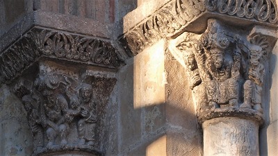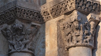 | 入り口の連続アーチは、柱頭彫刻ががある8つの円柱に繋がり、これら柱頭は、魂の救済と地獄の責め苦をあらわしています。 これら柱頭彫刻を制作したアトリエは、周歩廊とトランセプトにある聖人伝の柱頭彫刻も手掛けています。特徴としては、人物の目が長いこと、屈むような姿勢等が挙げられます。 |