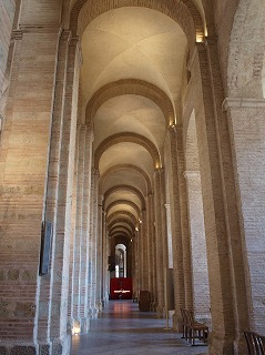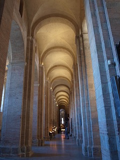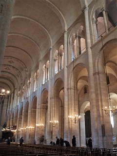 | Nef オジーヴ・ヴォールトで覆われたナルテックスに続く身廊は11ベイからなり、円筒型のヴォールトで覆われていて、その横断アーチは半円柱に続いていきます。 身廊は幅8/8.80メートル、高さ21.10メートルです。ちなみに身廊と側廊をあわせた幅は、32メートルです。 Précédée du narthex couvert de la voûte d'ogives, la nef est composée d'onze travées, voûtées en berceau en plein cintre sur des arcs doubleaux, qui retombent sur les demi-colonnes engaées. De 8 m de largeur, la nef centrale s'élève à 21,10 m : la nef et quatre bas-côtés ont une largeur de 32 m. |