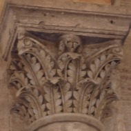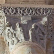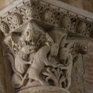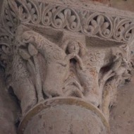 | Chapiteaux à gauche : le massacre des Innocents à gauche, et l'Annonciation et la Visitation | Chapiteaux à droite : le péché originel à gauche, et les lions |