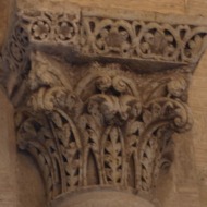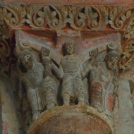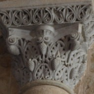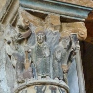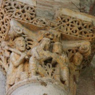 | トリビューンの小円柱にも彫刻が施されています。Bernard Gilduinと彼のアトリエが、ロマネスクの祭壇の制作から少し遅れて、トランセプトのトリビューンに装飾を施しました。 Les chapiteaux des colonnettes des tribunes sont également sculptés. Bernard Gilduin et son atelier ont décoré les tribunes du transept, peu après la réalisation de l'autel roman. 但しトランセプトの聖人伝の柱頭彫刻は別のアトリエによる作品で、このアトリエはポルト・デ・コントの彫刻、周歩廊の聖人伝の柱頭彫刻を手掛けています。 Mais les chapiteaux historiés au transept sont les oeuvres d'un second atelier, qui a réalisé les sculptures de la porte des Comtes et les chapiteaux historiés du déambulatoire. |