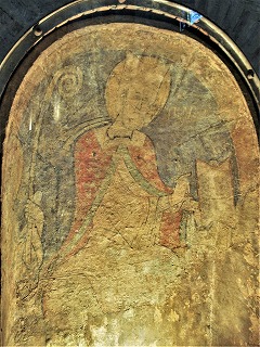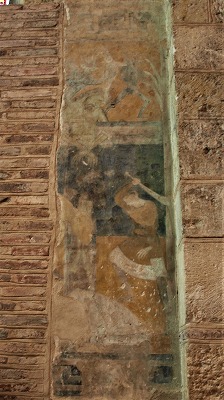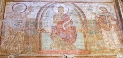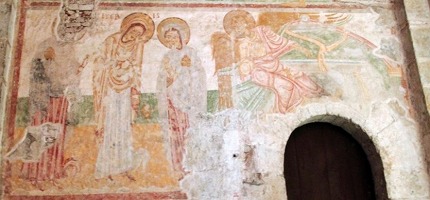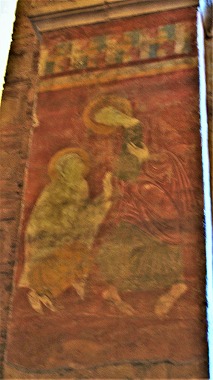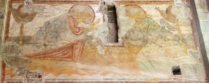 | Fresque : la Réssurection 北翼廊の西側の側廊に描かれたフレスコ画は、1970年代に発見されました。このフレスコ画はキリストの復活を表現していて、1180年頃に制作されました。 フレスコ画の右端に見える扉は、トリビューンへの階段に繋がります。 |