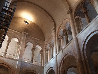 | Elévation 身廊の縦構造は2層です。 半円型の大アーケードの上に、トリビューンが見えます。トリビューンは柱頭彫刻がある2つの小円柱に繋がる2つ連続した半円型のアーケードで、身廊とトランセプトに開かれています。 トリビューンは半円筒型ヴォールトで覆われ、脇から身廊のヴォールトを支えています。 L'élévation de la nef est à deux niveaux. Les grandes arcades en plein cintre sont surmontées des tribunes, s'ouvrant sur la nef et le transept par les arcades jumelées en plein cintre, reposant sur double colonnettes à chapiteaux sculptés. La tribune voûtée en demi-berceau, contrebute latéralement la voûte de la nef. |