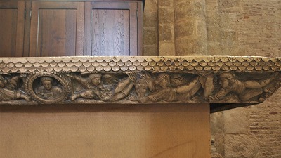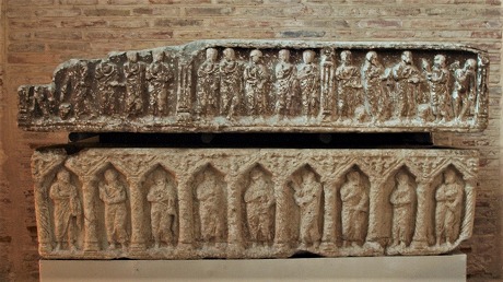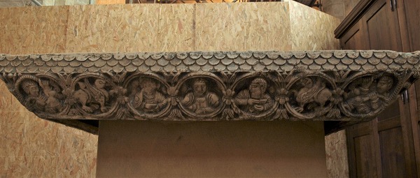| 底の部分には、小円柱に支えられたミトラ型のアーチの下に、トーガを纏った9人の人物が並び、中央にキリスト、その左隣にペトロ、右隣りにパウロがいます。 蓋の部分は、ピラスターで3つに区分けされ、その中にそれぞれ5人の人物がいます。中央に、使徒達に囲まれたキリストの姿があります。 |