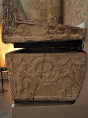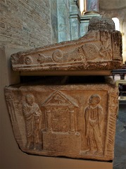 | 北翼廊の奥に、4世紀末又は5世紀初めに遡る初期キリスト教時代の石棺があります。この石棺は元来、ポルト・デ・コントの脇にある石棺同様、教会堂の周りに広がっていた墓地にあったものと考えられています。 底の部分と蓋のサイズは一致しないため、これらは元来別々の石棺だったと思われます。この石棺の中に、複数の人物の遺体が発見され、その中に、トゥールーズ伯のものがありました。 |