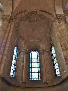 | エレガントなシルエットに包まれた後陣では、建物の一体感が感じられます。ロマネスクの教会堂の建設は、建築家レイモン・ガイラールによる指揮の下、後陣から始まりました。 後陣は5つの放射状祭室がある周歩廊、内陣、トランセプトに面した4つの後陣祭室で構成されます。 放射状祭室には、3つの半円型の開口部があります。但し中央の祭室には、半円型の開口部が5つあります。アプスとトランセプトの半円型の開口部は、柱頭彫刻がある小円柱で装飾されています。 |