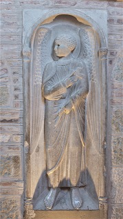 | キリスト、ケルビム、セラフィムのレリーフの周りには、より大きな2人の使徒と2人の天使のレリーフがあります(これら4つのレリーフの高さは1.67メートルで、キリスト、ケルビム、セラフィムは1.10メートル)。これら4つのレリーフは、姿勢、彫の深さの点で、前出の3つのレリーフとは異なり、古代ローマの彫像に近いといえます。 古代のトーガを身にまとった2人の使徒は、左手に福音書を持ち、右手で祝福のポーズをしています。 |