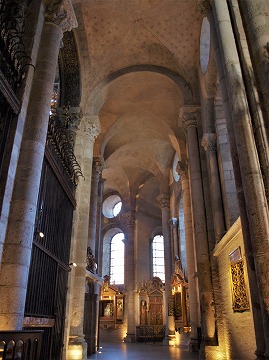 | La basilique en croix latine, est constituée de cinq vaisseaux, d'un tranespt à quatre absidioles, et du choeur entouré d'un déambulatoire à cinq chapelles rayonnantes : il s'agit de l'église de pèlerinage typique, ainsi que l'abbatiale Sainte-Foy de Conques et la cathédrale de Saint-Jacques-de-Compostelle. | |||