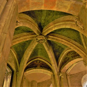 | 北翼廊最端にある後陣祭室(シャペル・ド・クリュシフィクス)の手前にある、東側廊のベイのヴォールトに、過越の子羊を描いたフレスコ画が残ります。8人の天使が、メダイヨンの中の子羊を支えます。 | ||