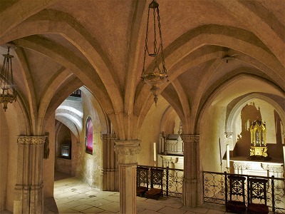 Crypte inférieure 四角形のプランに建つ、オジーヴ・ヴォールトで覆われたクリプトの下の階の工事は、1280年頃に始まりました。 下の階のクリプトには6つの祭室があり、ここにおさめられている聖遺物箱の中で最も有名なものは、聖王ルイの弟アルフォンス・ド・ポワティエにより1251年に寄贈された、サント・エピヌの聖遺物箱です。 Les travaux de la crypte inférieure voûtée d'ogives en forme de carré ont débuté vers 1280. Elle est flanquée de six chapelles, dans lesquelles le reliquaire le plus préstigieux, est celui de sainte Epine, offert en 1251 par Alphonse de Poitiers, frère du saint Louis (roi Louis IX). |