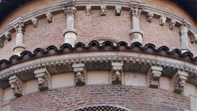 | La corniche à modillons surmonte le double portail. Elle est décorée des billettes et des fleurs à quatre pétales (motifs romans), ainsi que les métopes sculptées de rosaces (motif antique) entre les modillons. |