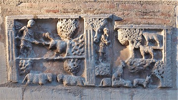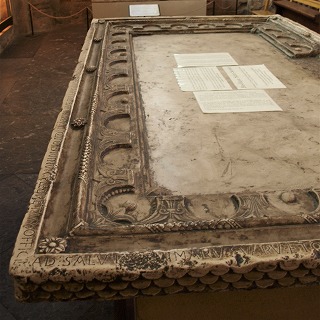 Bas-relief バシリカを取り囲んでいた墓地にあったと思われる、初期キリスト教時代の石棺の断片が、ポルト・デ・コントの左脇の壁に埋め込まれています。 Sur la partie gauche de l'enfeu des Comtes, on voit des fragments des sarcophages paléochretiens provenant probablement de la nécropole qui entourait la basilique. |
