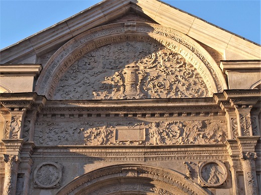 | Le tympan est sculpté des rinceaux et du grand candélabre. Dans les rinceaux de la frise, un cartouche se trouve entre deux sirènes aux longs cheveux. Deux médaillons dans les écoinçons de l'arc, représentant l'Annonciation, ont été bûchés à la Révolution : l'archange Gabriel dans le médaillon gauche, et la Vierge dans celui droit. |