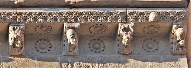 La corniche au-dessus du tympan, est supportée par huit modillons sculptés. |