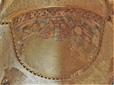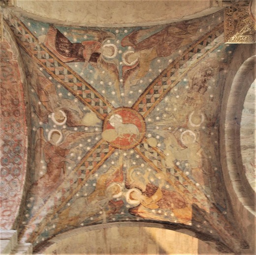 | La voûte d'une travée du bas-côté oriental du croisillon nord, précédant l'absidiole nord (chapelle de Crucifix), conserve la fresque représentant la glorification de l'Agneau. Huit anges élèvent l'Agneau Pascal dans un médaillon. | ||