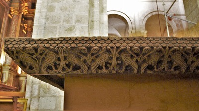 西側の面では、植物モティーフの中に鳥が向かい合って姿を見せます。 La face vue de l'ouest est décorée des oiseaux affrontés avec des motifs végétaux. |